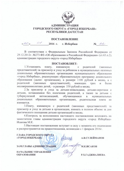 Постановление «Об утверждении оплаты за содержание детей в дошкольных образовательных учреждениях г.Избербаша»